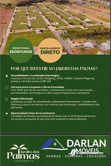 Loteamento JARDIM DAS PALMAS PARCELAMENTO DIRETO EM ATE 108 MESES DIRETO COM A CONSTRUTORA ENTRADA DE 10% PARCELAMENTO DE 24 A 47 TAXA DE 0,65.%A.M PARCELAMENTO DE 48 A 108 TAXA DE 0,75% AM