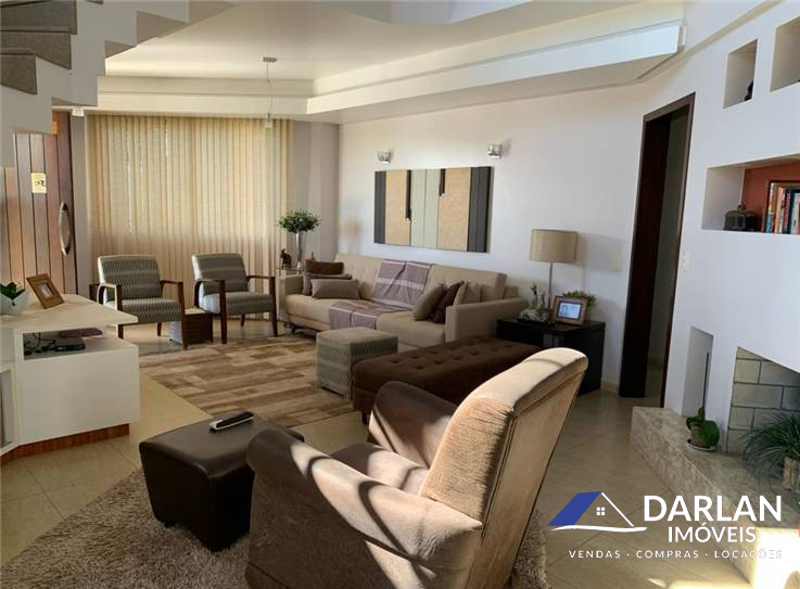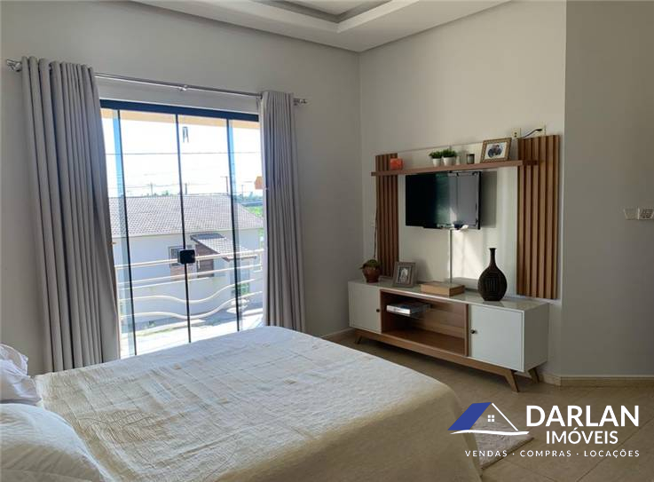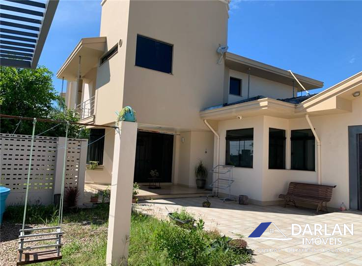 Casa alto padrão com 375 m2, porcelanato, laje inclinada, teto rebaixado com gesso. 5 quartos, sendo 2 suítes (suíte master com hidromassagem), 1 banheiro social, 2 lavabos, sala de estar com lareira, sala de jantar e cozinha conjugadas, 2 despensas e área de serviço. Espaço gourmet com churrasqueira, fritadeira e fogão a lenha. Garagem fechada pra 3 carros. Terreno 16x35 m. Aquecimento solar, espaço pra piscina. Ficam todos móveis sob medida.