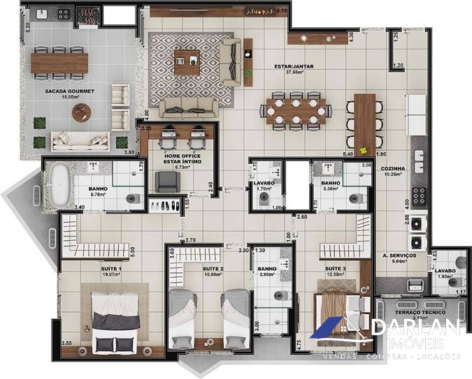 Apto com três suítes, um home Office, estar e jantar integrado, cozinha, área de serviço, dois lavabo, ampla sacada com 18,00m2. Três vagas de Garagem.
