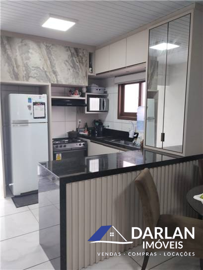 Casa com dois quartos, sendo uma suíte, sala e cozinha conjugada, área serviço, edícula com um deposito, banheiro, churrasqueira e garagem. Ficam todos os moveis sob medida e alguns eletros e moveis soltos.